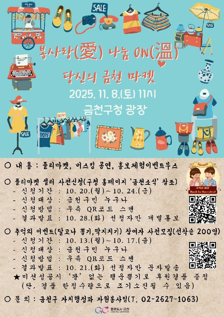 [금천구 세계타임즈=이장성 기자] 금천구(구청장 유성훈)는 오는 11월 8일 금천구청 광장 앞에서 ‘봉사랑(愛) 나눔ON(溫), 당신의 금천마켓’을 연다고 밝혔다.