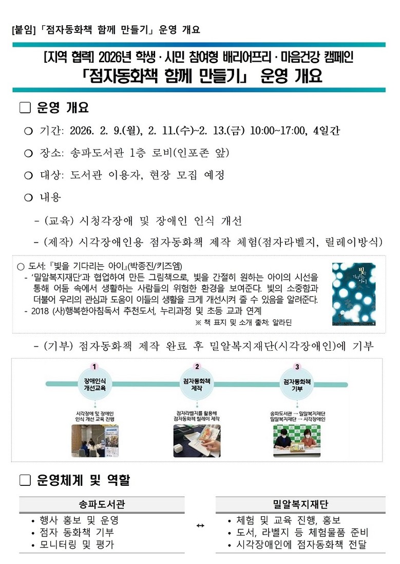 행사는 2월 9일과 2월 11일부터 13일까지 총 4일간 송파도서관 1층 로비에서 진행되며, 도서관 이용자 누구나 현장에서 참여할 수 있다. 참가자는 시청각장애 이해와 장애 인식 개선에 대한 간단한 안내를 반은 뒤, 점자 라벨지를 활용해 그림책에 점자를 부착하는 방식으로 점자동화책 제작에 참여하게 된다.