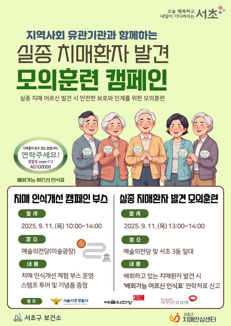 - 9월 11일 예술의전당·서초3동 치매안심마을일대에서 ‘실종 치매환자 신속 발견 모의훈련’ 실시