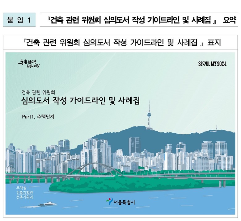 ‘건축 관련 위원회 심의도서 작성 가이드라인 및 사례집 Part1. 주택단지’는 12월 30일부터 서울시 누리집(https://news.seoul.go.kr/citybuild/archives/530508)에서 전자책으로 누구나 볼 수 있고, 활용할 수 있다.