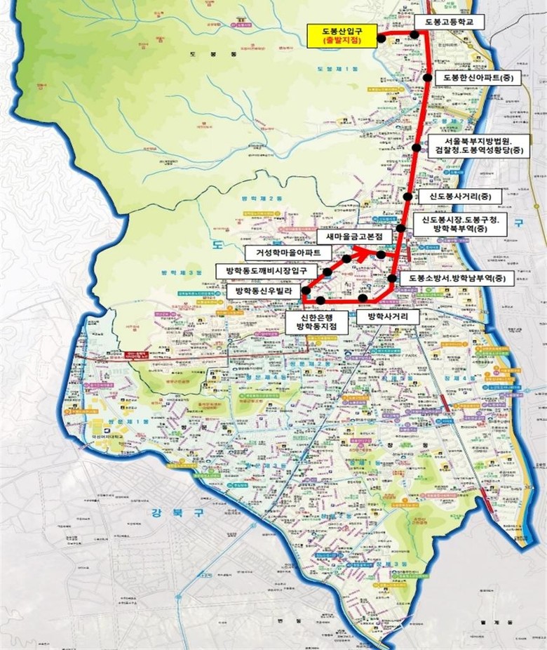 ▲1번 노선 도봉산입구↔도봉역↔방학북부역↔방학남부역↔도깨비시장 ▲2번 노선 신창‧창동시장↔태영아파트↔쌍문역↔주공3단지↔도봉문화정보도서관 ▲3번 노선 방학증학교정문↔도깨비시장↔거성학마을↔방학북부역 ▲4번 노선 방학동신우빌라↔청구아파트↔주공1단지↔창동역 ▲5번 노선 방학동신동아타워↔방학사거리↔도봉구민회관↔쌍문역