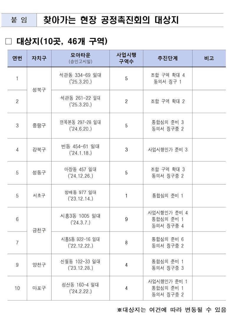 최진석 서울시 주택실장은 “찾아가는 현장 공정촉진회의는 모아타운 사업을 신속하게 추진하기 위해 초기 지연 문제를 해소하는 선제적 조치가 될 것”이라며 “주민의 애로사항을 현장에서 직접 듣고, 전문가의 조언과 행정 지원을 통해 사업기간 단축 효과를 시민이 체감할 수 있도록 하겠다”고 말했다.