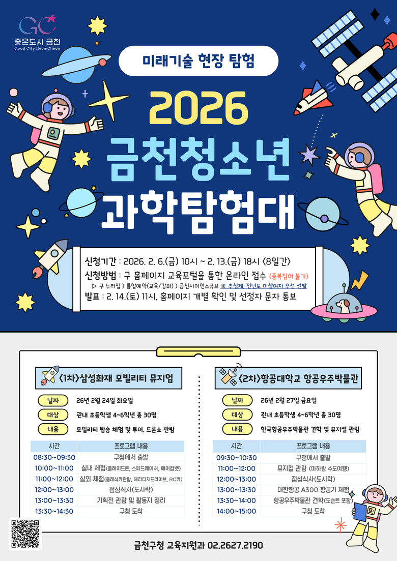 [금천구 세계타임즈=이장성 기자] 금천구(구청장 유성훈)는 관내 초등학생을 대상으로 미래기술 현장을 직접 체험하는 ‘2026년 금천 청소년 과학탐험대’ 프로그램을 운영한다고 밝혔다.