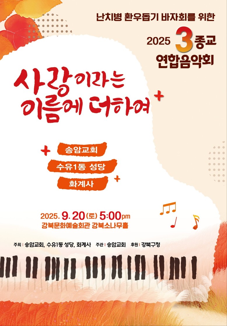 주관을 맡은 송암교회 김정곤 담임목사는 “25년간 한결같은 마음으로 함께해주신 화계사와 수유1동 성당 덕분에 새로운 첫걸음을 내딛을 수 있었다”며 “이번 3종교 연합 음악회가 종교를 넘어 모두에게 따뜻한 온정을 일깨우고, 지역 주민들이 함께 음악을 즐길 수 있는 시간이 되길 바란다. 난치병 환우들에게 희망을 전하는 이번 행사에 많은 관심과 참여를 부탁드린다”고 전했다.