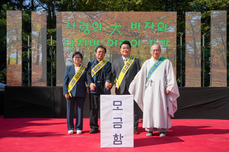 | ▲ 지난해 제25회 난치병어린이돕기 종교연합 바자회가 진행됐다. 왼쪽부터 이순희 강북구청장, 수유1동 성당 남궁은 신부, 송암교회 김정곤 목사, 화계사 우봉 스님이 기념촬영을 하고 있다. |
