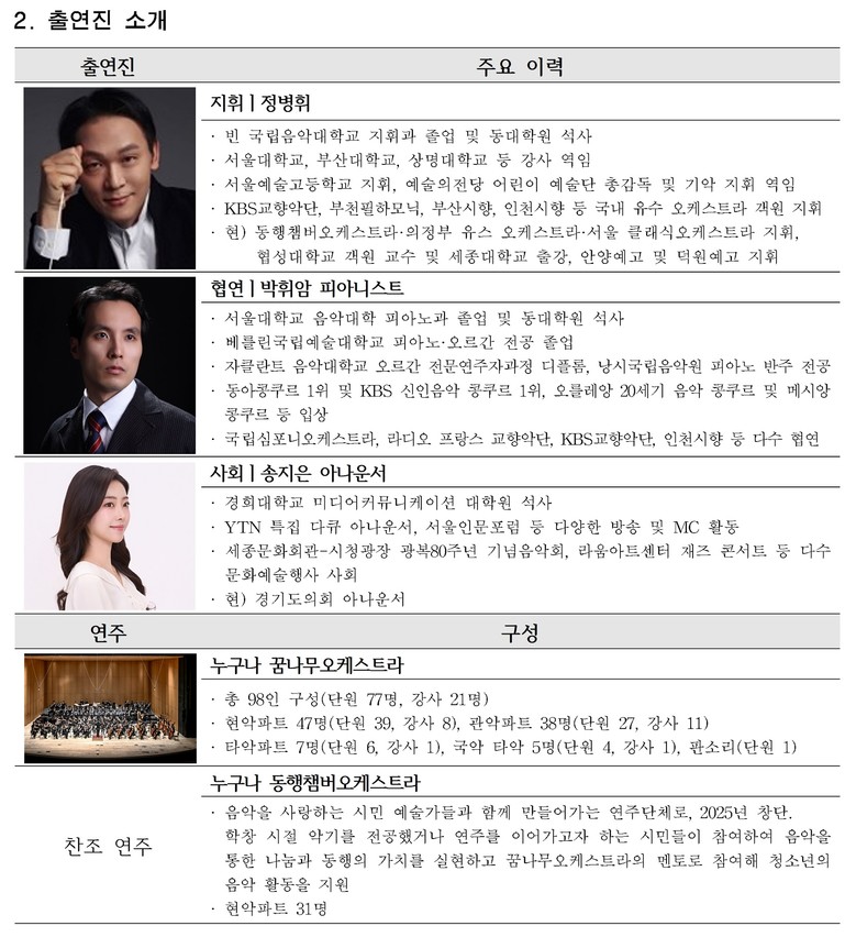 이번 무대에는 2025년 창단된 시민 오케스트라 ‘누구나 동행챔버오케스트라’가 함께한다. 음악을 사랑하는 시민들이 청소년 단원의 멘토로 참여해 한 무대에서 연주하며, 세대를 넘어 서로의 음악을 배우고 응원하는 특별한 장면을 만들어낸다.