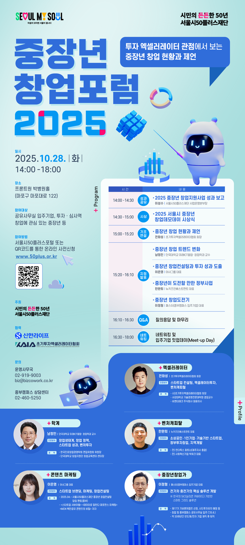 ‘전문가 포럼’에서는 ‘투자 엑셀러레이터 관점에서 본 중장년 창업 현황과 제언’을 주제로 창업·투자·학계 전문가가 참여해 변화하는 창업 환경과 성장전략을 공유한다. 기조연설은 전화성 (사)초기투자엑셀러레이터협회 회장이 맡아, 국내 중장년 창업의 현황과 과제를 분석하고, 투자 엑셀러레이터 관점에서 본 성장 가능성과 지원 방향을 제시할 예정이다.