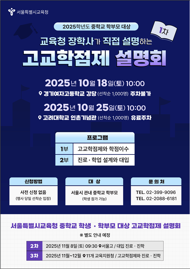 이번 10월 설명회 1부에서는 서울시교육청 고교학점제 업무 담당 장학사가 △고교학점제의 이해와 학점 이수 제도에 대해 설명하고, 2부에서는 △진로·학업 설계와 대입 준비 등에 대해 안내한다.