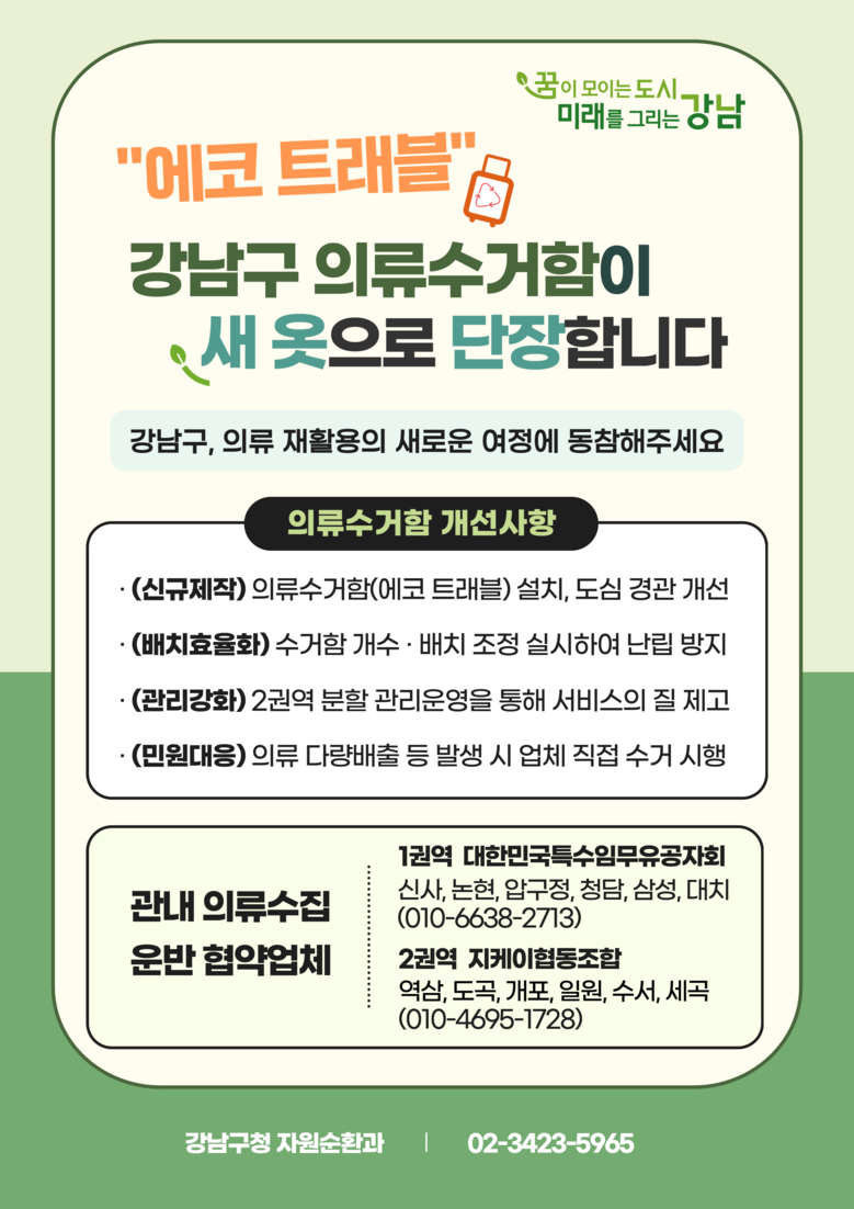 조성명 강남구청장은 “기후변화와 쓰레기 매립 위기에 대응하기 위해 자원순환 활성화는 선택이 아닌 필수”라며 “의류 수거함을 시작으로 다양한 폐기물 분야에 ‘강남형 자원 선순환 모델’을 확대 적용해 폐기물 감축을 선도하는 자치구로 도약하겠다”고 밝혔다.