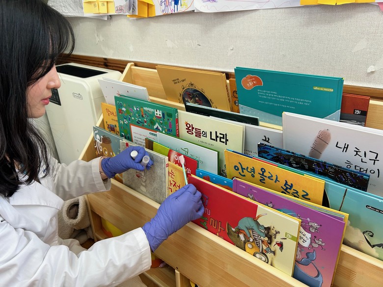 검사 방법은 보육시설에 방문해 영유아들의 접촉이 많은 장난감, 교구 등 실내 환경에서 면봉채취법(Swab)으로 검체를 채취한 후 실시간중합효소연쇄반응(Real-time PCR) 검사를 수행했다.
