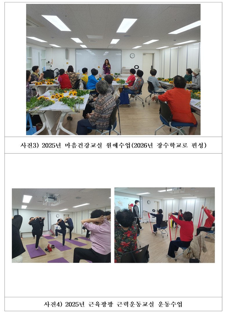 정서 건강을 위한 ‘마음건강 교실’은 3·4·6·7·9·11월, 매주 목요일 오후 2시 30분부터 3시 30분까지 운영된다. 미술치료, 노래교실, 건강댄스, 웃음치료 등 체험형 프로그램을 통해 우울감 완화와 정서 안정을 돕는 과정으로, 월별 4주 과정으로 진행된다.