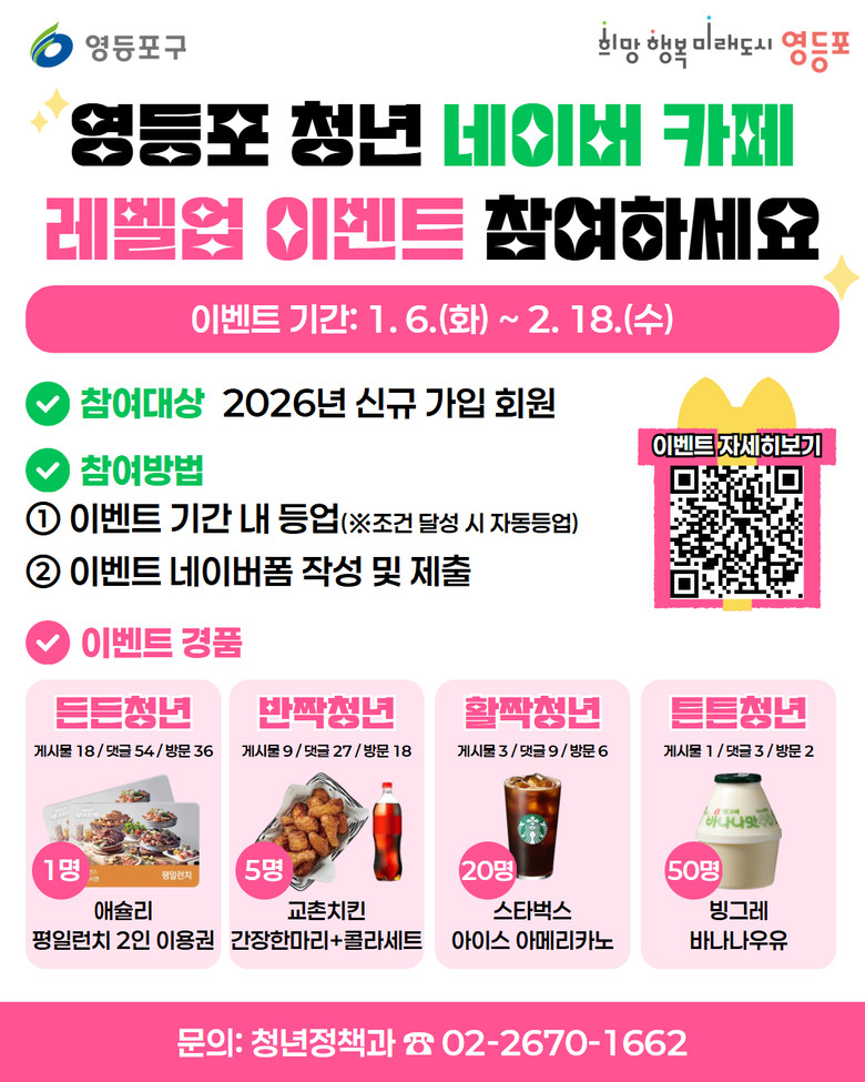 이번 이벤트는 오는 2월 18일까지 운영되며, 2026년에 영등포 청년 네이버 카페에 신규 가입한 회원을 대상으로 한다. 이벤트 기간 동안 게시물 작성, 댓글 참여, 방문 횟수 등 카페 활동 조건을 충족하면 별도의 신청 없이 회원 등급이 자동으로 상향되며, 등급 상향 시 이벤트에 참여할 수 있다. 도배성 게시물이나 댓글은 운영 규정에 따라 제외될 수 있다.