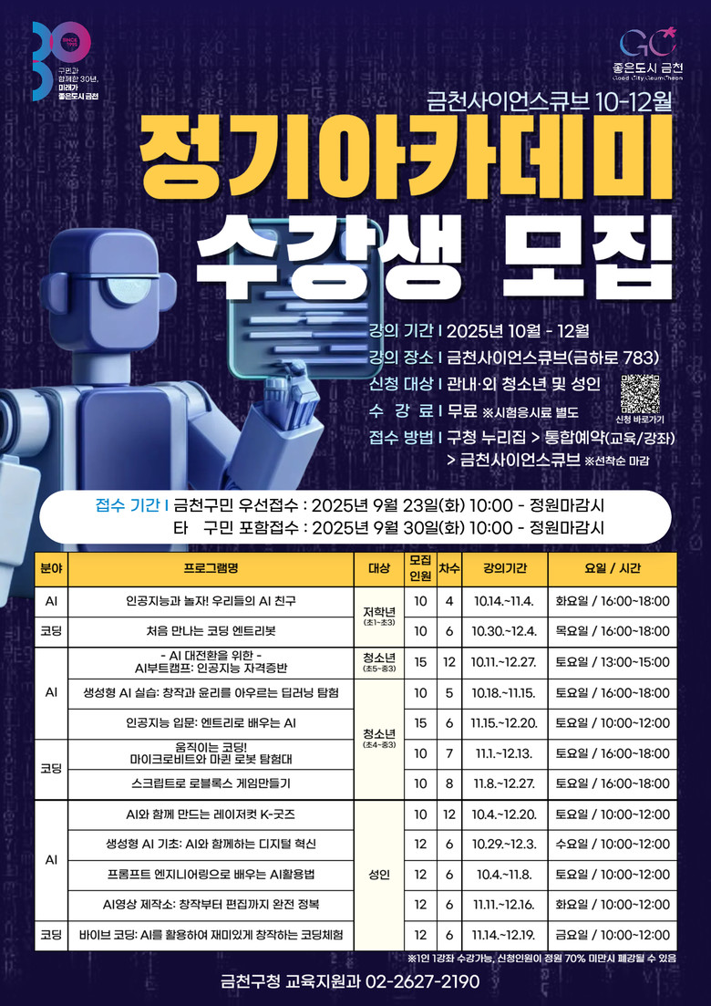 유성훈 금천구청장은 “인공지능과 코딩은 더 이상 먼 미래의 기술이 아니라, 우리 삶 속에서 누구나 활용할 수 있는 필수 역량”이라며 “금천사이언스큐브가 주민들이 쉽고 즐겁게 배우며 실제 삶과 진로에 도움이 되는 배움터가 되도록 최선을 다 하겠다”라고 말했다.