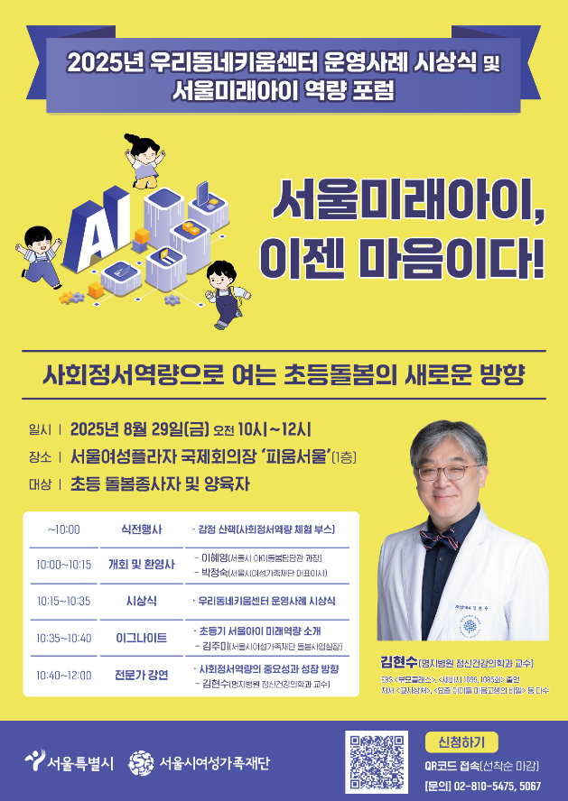 이어지는 포럼에서는 김현수 교수(명지병원 정신건강의학과)가 ‘AX시대(인공지능 확산 시대)에 초등아동을 위한 사회정서역량 증진 방안’을 주제로 기조 강연을 진행한다.
