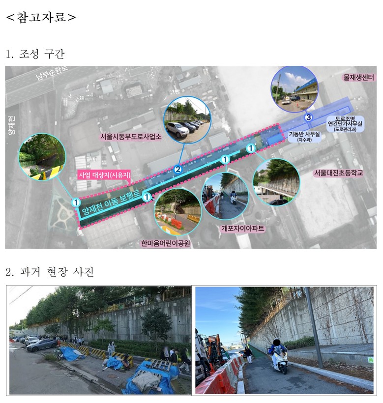 문제의 구간은 인근 주택가와 대진초등학교에서 양재천으로 이어지는 경사로와 보행로로, 주민들이 평소 자주 이용하는 길이다. 시유지지만 마땅히 활용되지 못하고 방치된 채 장기 불법주정차 차량, 쓰레기 투기, 오토바이 통행 등으로 극심한 민원이 제기돼 왔다. 특히 해당 구간의 차도는 법적으로 도로로 지정돼 있지 않아 불법주정차 단속조차 어려운 사각지대였고, 치안 우려까지 겹치며 대표적인 슬럼화 지역으로 지적돼 왔다.