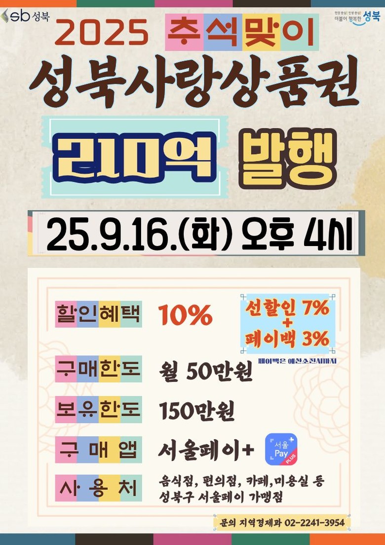 추석 명절을 맞아 발행되는 이번 성북사랑상품권은 기본 7% 할인에 더해 예산 소진 시까지 선착순으로 3% 페이백을 추가 제공해 총 10%의 할인 혜택을 누릴 수 있다. 다만 페이백 이벤트는 한정된 예산으로 운영되는 만큼 조기 소진 가능성이 있어 신속한 참여가 필요하다. 상품권은 서울페이+ 앱에서 구매와 사용이 가능하며, 성북구 내 서울페이 가맹점에서 사용할 수 있다.