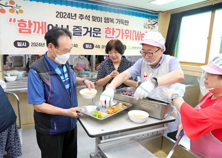 | ▲ 유성훈 금천구청장이 지난해 9월 13일 추석을 맞아 금천한내어르신복지센터에서 특별식사 배식을 하고 있다 |