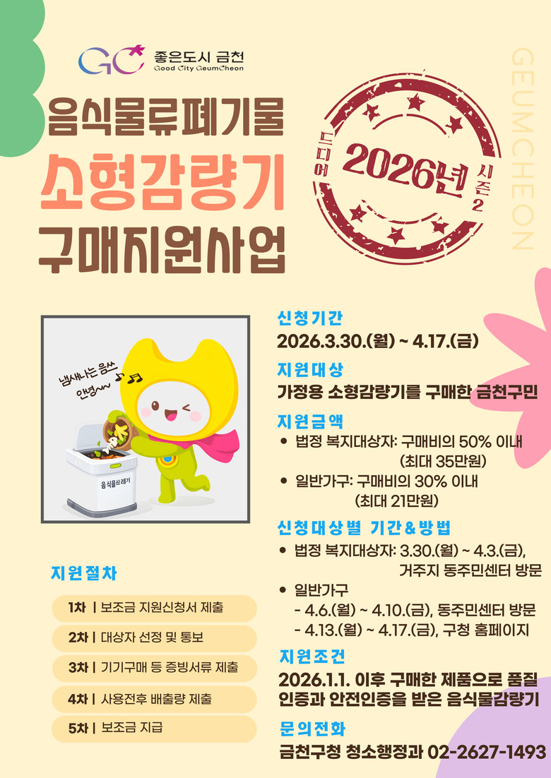지원 대상은 사업 공고일(3월 23일) 기준 주민등록상 거주지가 서울특별시 금천구이고, 2026년 1월 1일 이후 감량기를 구매했거나 구매 예정인 경우 신청할 수 있다.