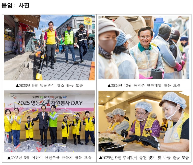 최호권 영등포구청장은 “자원봉사의 날 활동은 구민과 함께 지역을 가꿔나가는 뜻깊은 프로그램”이라며 “구민이 주체가 되는 참여형 봉사활동을 확대해 따뜻한 공동체를 만들어 나가겠다”라고 전했다.