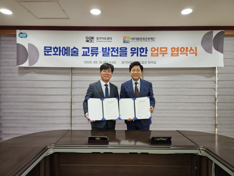 [경기도 세계타임즈 = 송민수 기자] 경기아트센터(사장 김상회)가 유관기관과의 연이은 업무협약으로 공공성과 문화적 가치를 확장하고 있다. 지난 9월 17일에는 경기도의료원(원장 이필수)과 협약을 맺고, 18일에는 여주세종문화관광재단(이사장 이순열)과의 협약으로 협력 체계를 구축했다. 이번 협약은 각각 공공의료와 문화복지, 공연예술과 관광을 결합해 도민에게 보다 폭넓은 혜택을 제공하고, 지역사회와의 상생 기반을 강화하기 위한 취지에서 체결되었다.