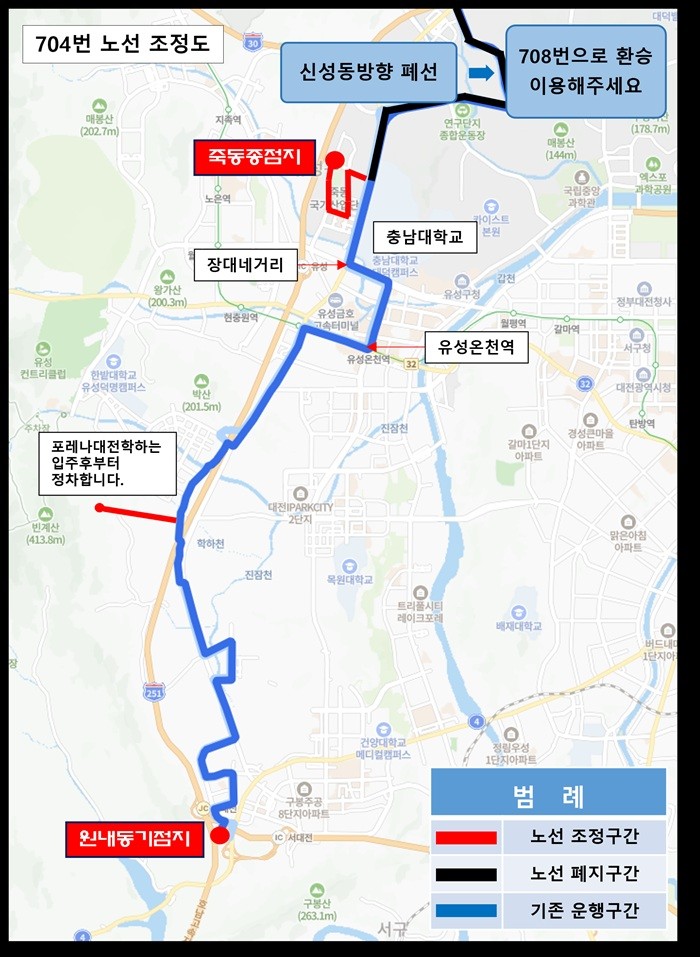 704번은 원내동에서 죽동산업단지까지 운행되며, 대전보훈요양원죽동, 죽동푸르지오, 죽동천년나무 정류장을 신설한다.