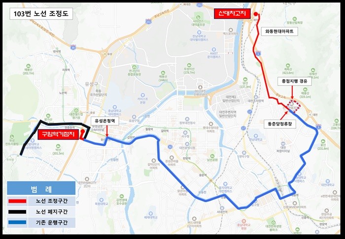 먼저, 103번은 수통골에서 동춘당까지 운행하는 노선으로 이번 조정을 통해 구암역에서 신대동공영차고지까지 운행한다.
