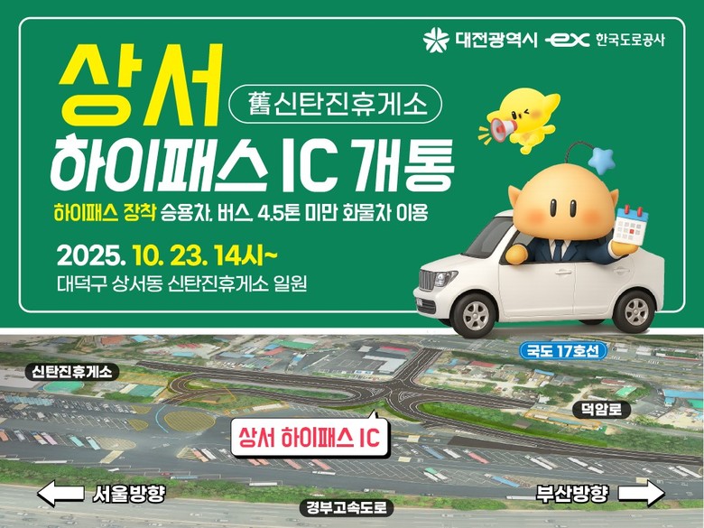 [대전 세계타임즈=이채봉 기자] 대전시는 경부고속도로 서울방향 상행선 중 신탄진휴게소 내 설치된 상서 하이패스 나들목(IC)을 23일(목) 오후 14시부터 본격 개통한다.