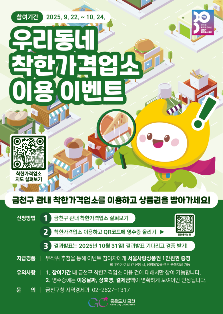 유성훈 금천구청장은 “착한가격업소는 물가 안정과 지역경제 활성화에 기여하고 있다”라며 “이번 이벤트를 통해 주민들이 착한가격업소를 더 많이 알게 되고, 직접 이용하는 계기가 되길 바란다”고 전했다.
