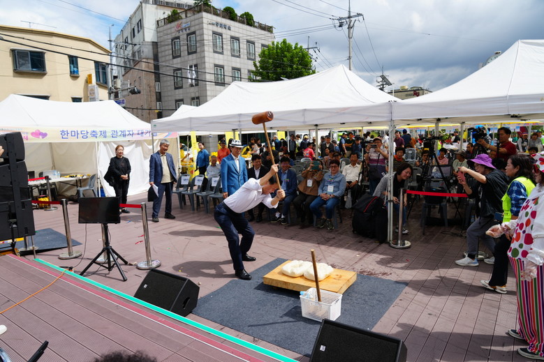 | ▲ 전통시장 한마음 축제에서 이승로 성북구청장이 떡메를 치고 있다 |