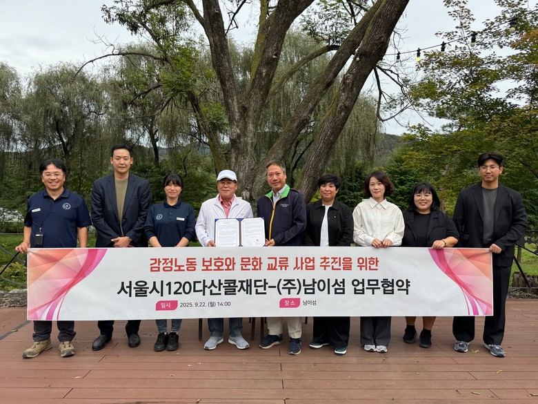 [서울 세계타임즈=이장성 기자] 서울시 대표적 민원 소통 창구인 서울시120다산콜재단(이사장 이이재)과 주식회사 남이섬(대표 민경혁)이 두 손을 맞잡았다. 양 기관은 9월 22일, 남이섬에서 문화·예술 및 자연을 통한 감정노동 종사자 보호 및 치유 프로그램 개발 및 운영을 위한 업무협약(MOU)을 체결했다.
