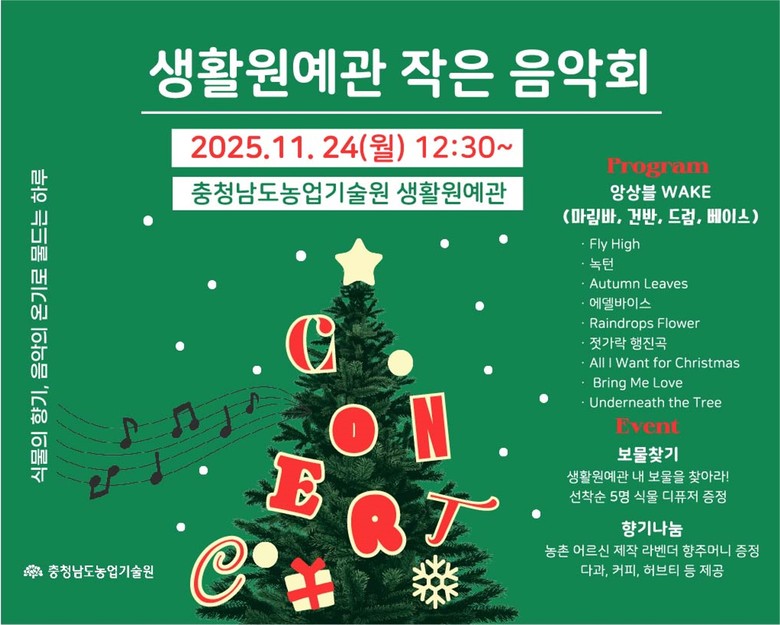 [충남 세계타임즈=이현진 기자] 충남도 농업기술원은 오는 24일 예산군 신암면 기술원 내 생활원예관에서 ‘작은 음악회’를 개최한다고 18일 밝혔다.