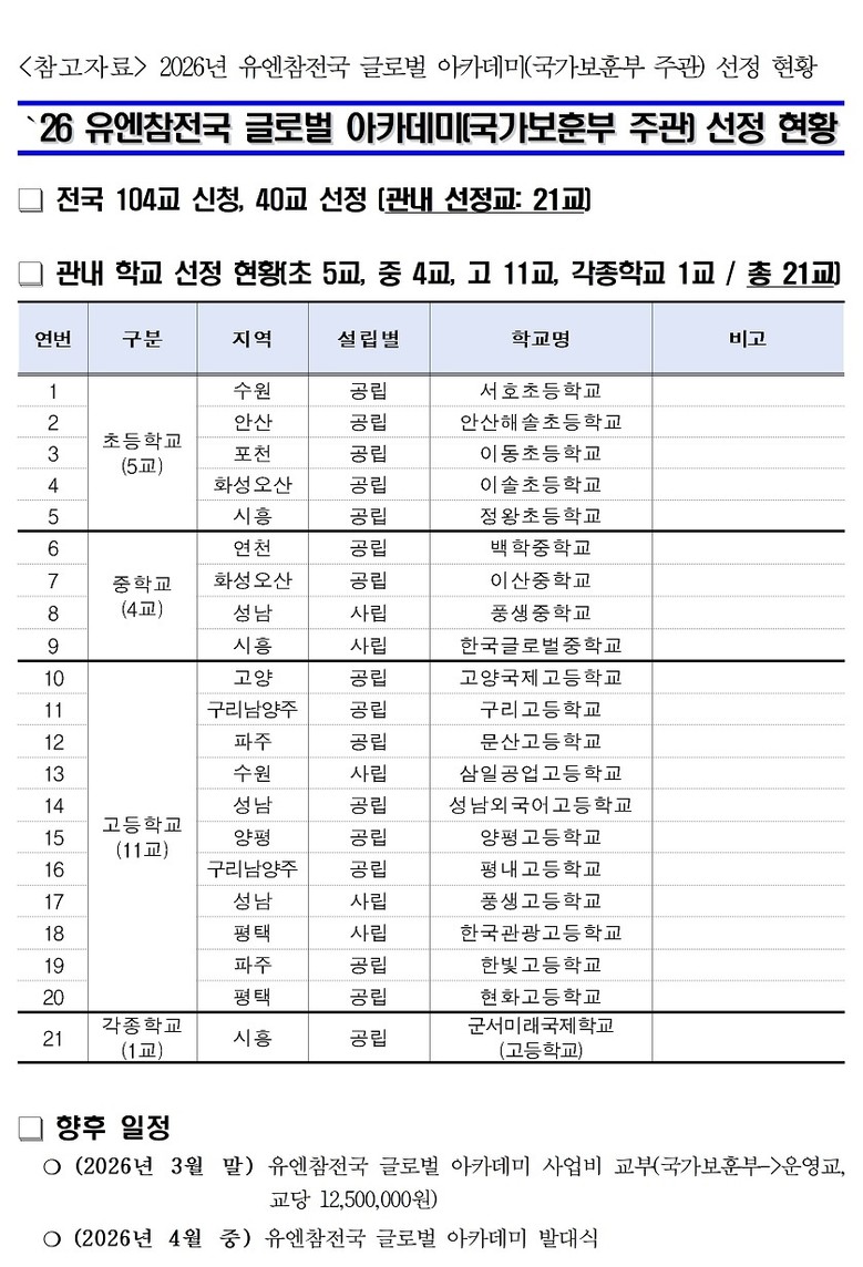 [경기도 세계타임즈=송민수 기자] 경기도교육청(교육감 임태희)이 국가보훈부 주관 ‘2026년 유엔참전국 글로벌 아카데미’ 운영교 공모에서 모두 21개교(초 5교, 중 4교, 고 11교, 각종학교 1교)가 선정됐다. 이는 전국 40개교 중 경기도 관내 학교가 절반이 넘는(52.5%) 성과로 전국 최대 규모다.