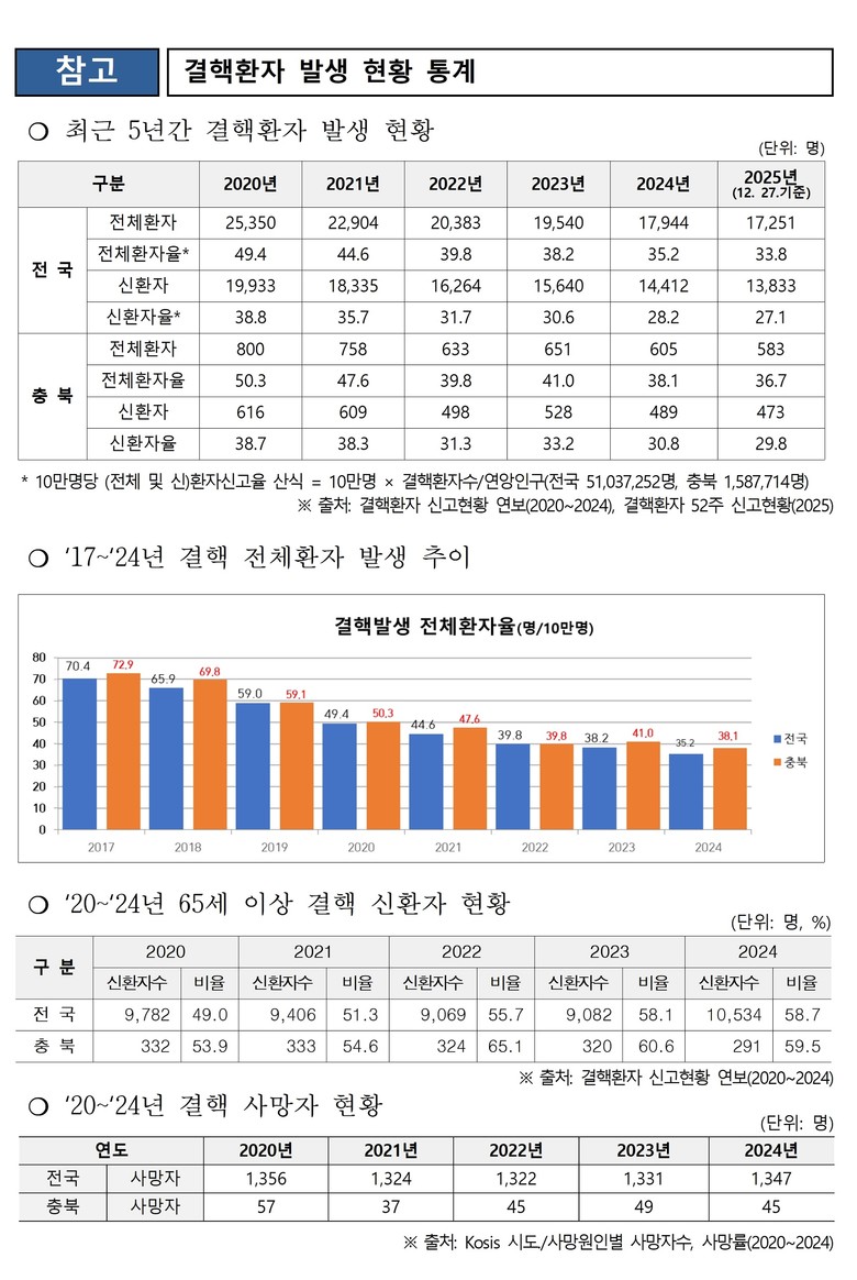 한편, 우리나라 결핵 발생률은 해마다 감소하고 있지만 OECD 국가 중 최상위권*으로 특히 면역력이 떨어지는 노인들에게 많이 발생하는 것으로 알려졌다. 충북에서도 65세 이상 결핵환자가 약 60%로 노인층에 대한 결핵검진 등이 더욱더 필요한 상황이다.
