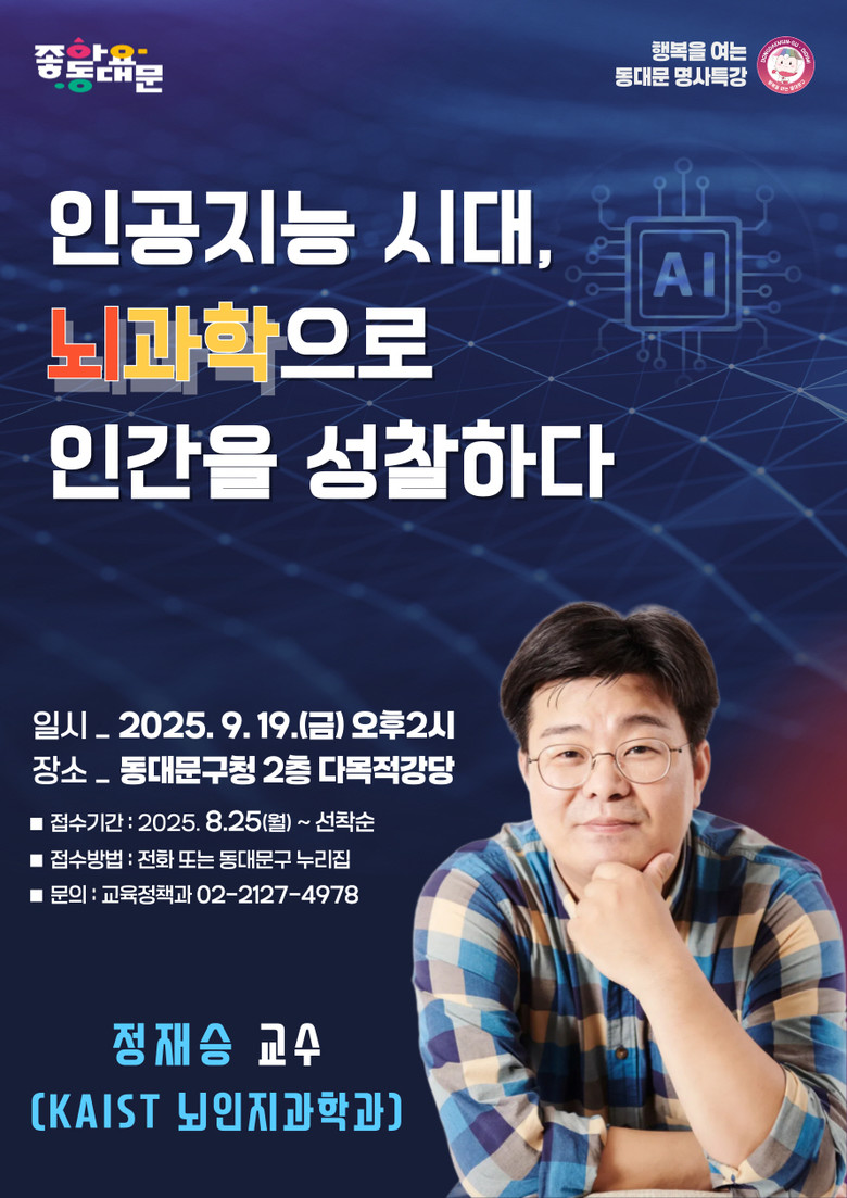 이번 명사특강은 인공지능·뇌과학·미래 사회에 관심이 있는 구민과 직원 누구나 참여할 수 있으며, 참여를 원할 경우 동대문구청 누리집을 통한 온라인 신청 또는 전화(02-2127-4978)로 사전 신청하면 된다.