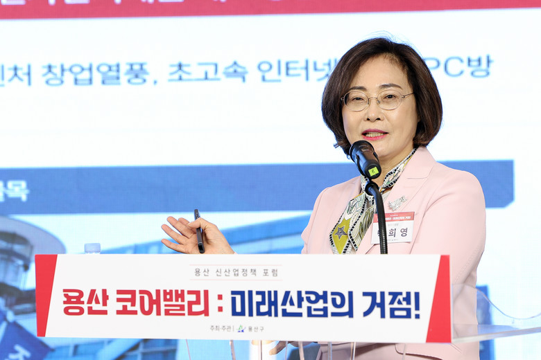 박희영 용산구청장은 ‘리부트 용산’을 주제로 한 기조연설에서 “전자상가 일대를 AI·ICT 중심지로 전환하고, 창업·교육·연구가 집적되는 도시 모델을 만들겠다”고 밝혔다. 국제업무지구 개발과의 연계를 통해 용산 코어밸리를 미래산업의 중추로 키우겠다는 구상이다.