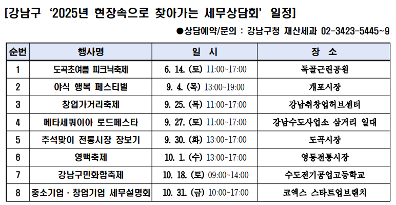 구는 이러한 호응을 바탕으로 상담회를 10월 말까지 6차례 더 이어간다. 앞으로의 일정은 ▲9월 25일 창업가거리축제(강남취창업허브센터) ▲9월 27일 메타세쿼이아 로드페스타(양재천로) ▲9월 30일 추석맞이 장보기 행사(도곡시장) ▲10월 1일 영맥축제(영동전통시장) ▲10월 18일 강남구민화합축제(수도전기공업고) ▲10월 31일 중소기업·창업기업 세무설명회(코엑스 스타트업브랜치) 등이다. 상담 예약은 구청 재산세과 (☎02-3423-5445~9)로 문의하면 된다.