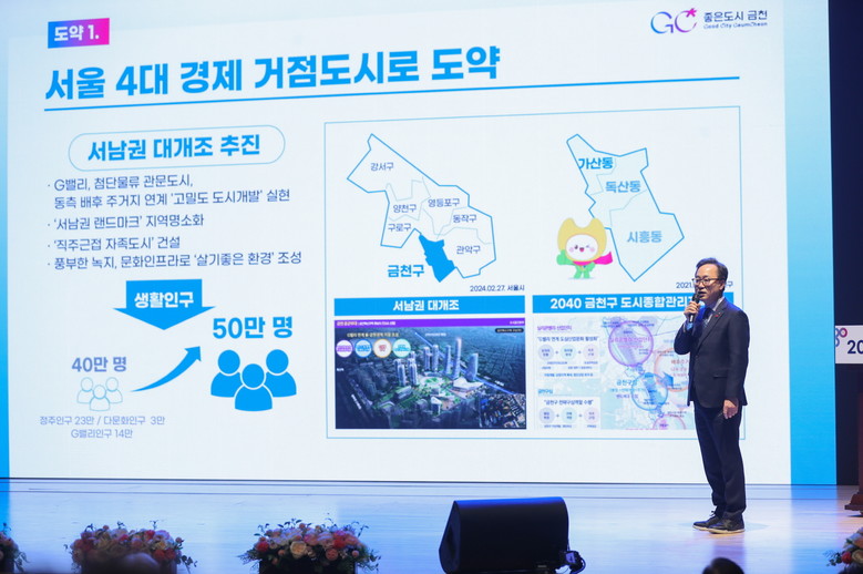 | ▲ 유성훈 금천구청장이 2025 새해인사회 행사에서 ‘금천 미래 30년’을 발표하고 있다. |