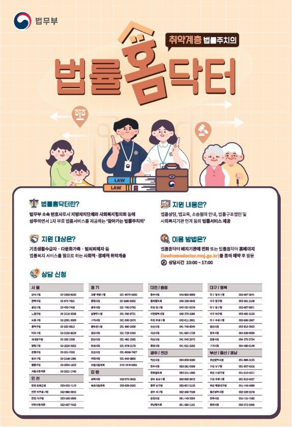 ‘법률홈닥터’는 사회적.경제적 취약계층에게 1차 무료 법률서비스를 제공하는 사업이다. 1차 법률서비스에는 법률상담, 법교육, 법률문서 작성 조력, 유관기관 연계 등이 포함되며, 소송구조, 소송수행은 제외된다.