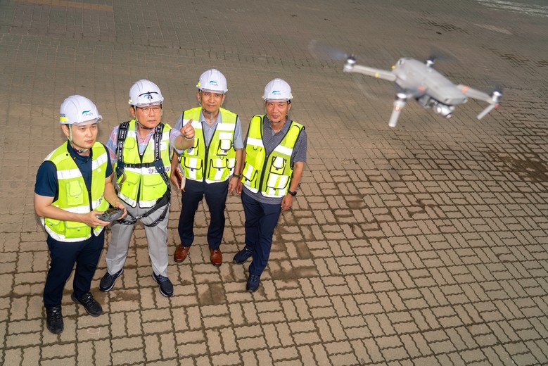 | ▲ 한국영(왼쪽 두 번째) 서울시설공단 이사장이 서울 강남구 탄천2고가교 현장에서 드론을 활용해 자동차 전용도로 정밀안전점검 현장을 점검하고 있다 |
