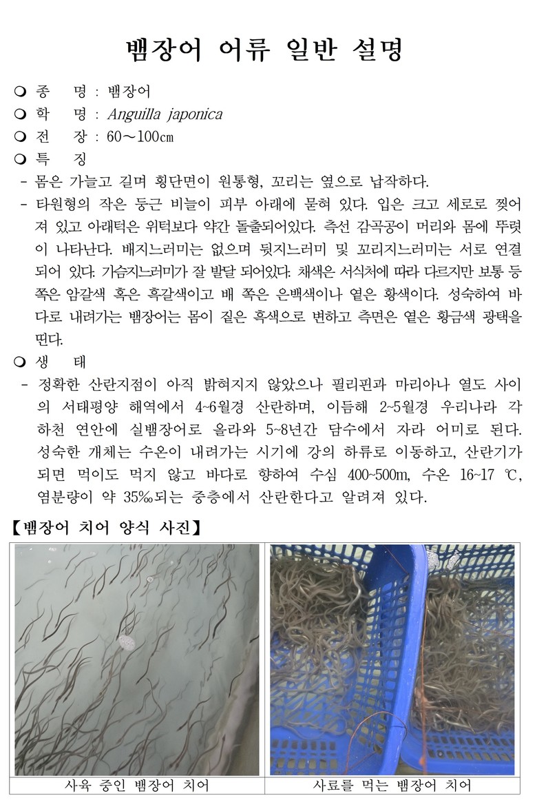 이번에 방류하는 뱀장어(Anguilla japonica)는 태평양 심해에서 부화하여 강으로 올라오다 포획(5cm 내외)된 것을 연구소에서 구입해 39일간의 사육 기간을 거쳐 10cm 이상 크기로 육성한 것이며, 수산생물 전염병 검사와 유전자 검사를 마친 건강한 어린 뱀장어라고 한다.