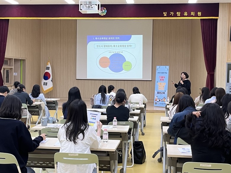 [시흥시 세계타임즈=송민수 기자] 4월 19일(금), 빛가람유치원은 2024 「통합교육 중점 유치원」으로 통합교육에 대한 학부모의 인식 개선 및 교사 역량 강화를 위해 전문가를 초빙하여 관내 학부모 및 교사와 함께하는 연수를 실시하였다.