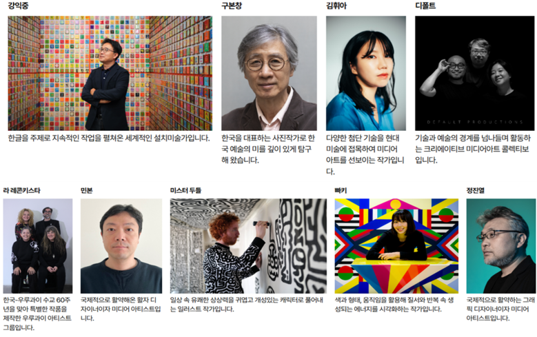 또한 한국국제교류재단과 협력을 통해 강익중, 구본창, 라 레콘키스타(우루과이) 등 유명 작가의 작품도 확장된 형태로 전시된다.