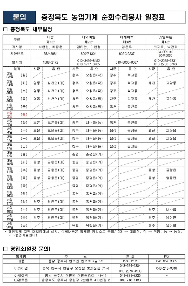 충북에서는 청주, 제천, 보은, 옥천, 영동, 증평, 괴산, 음성 8개 시군에서 총 4개 수리봉사반(7명)이 편성되며, 수리봉사반은 일정에 따라 해당 지역 농기계 대리점과 협의해 마을 단위로 순회하며 점검·정비를 실시한다.
