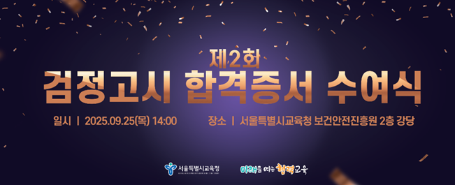 [서울 세계타임즈=이장성 기자] 서울특별시교육청(교육감 정근식)은 9월 25일(목) 14시부터 서울시교육청 보건안전진흥원 2층 강당에서 ‘2025년도 제2회 초·중·고등학교 졸업 학력 검정고시 합격증서 수여식’을 개최한다고 밝혔다.