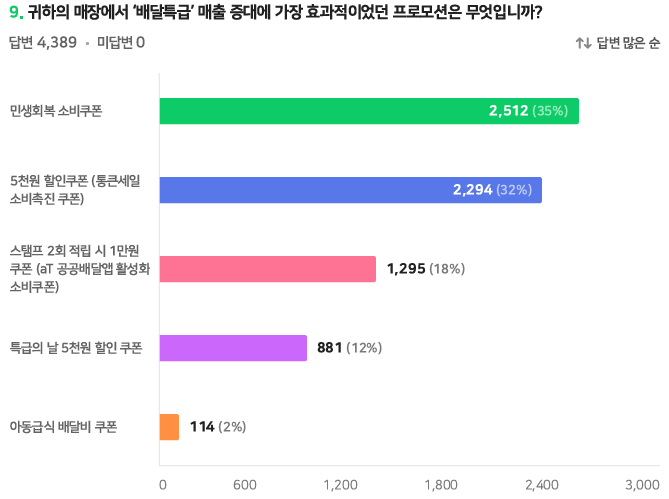 배달특급 매출 증대에 가장 효과적이었던 프로모션을 묻는 질문에는 전체의 35%가 정부의 ‘민생회복 소비쿠폰’을 꼽아 가장 높은 응답률을 기록했다. 이어 경기도의 통큰 세일 소비촉진 쿠폰이 32%, aT 공공배달앱 활성화 소비쿠폰이 18%를 차지했다.