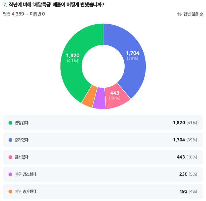 - 전년 대비 배달특급 매출 늘었다 응답 39%, 매우 늘었다 4% 등 답해