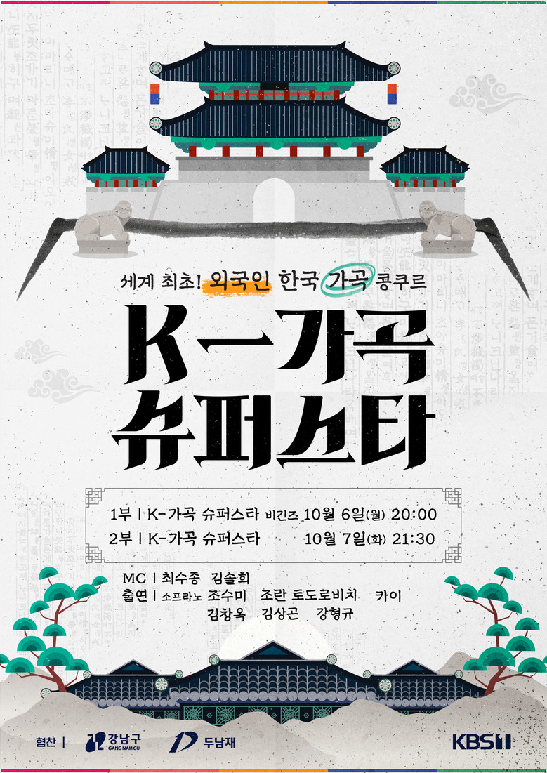 – 11개국 13명 참가자 본선 경연, 조수미 특별공연, 다큐멘터리로 만나는 한국 가곡 – [강남구 세계타임즈=이장성 기자] 꿈이 모이는 도시, 미래를 그리는 강남구(구청장 조성명)가 개청 50주년을 맞아 한국 가곡의 아름다움을 세계 무대에 알리는 글로벌 경연 「K-가곡 슈퍼스타」를 후원한다. 이번 행사는 오는 9월 30일 오후 7시 여의도 KBS홀에서 열리며, 전 세계 11개국 13명의 외국인 성악가가 무대에 올라 한국 가곡을 선보인다.