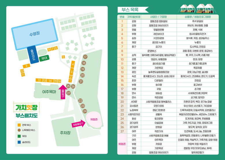 현장에서는 버블쇼, 페이스 페인팅 등 어린이들뿐 아니라 전 연령층이 함께 즐길 수 있는 각종 이벤트 프로그램을 준비했다. 일정 금액 이상 구매 고객에게는 참여 자활기업의 생산품과 여주목마 식사권을 증정하는 이벤트도 진행한다.
