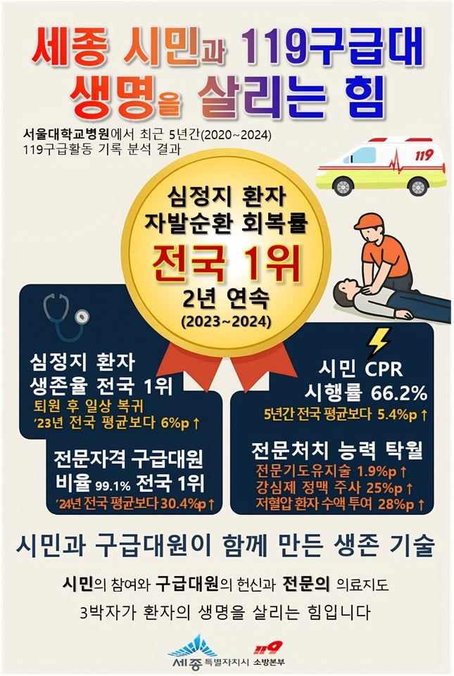 앞서 세종소방본부(본부장 박태원)은 ‘2024년 심정지환자 자발순환 회복률’ 부문에서 2년 연속 전국 1위를 차지했다.