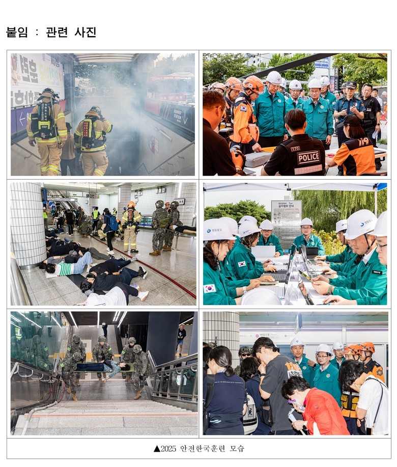 이번 훈련은 최근 발생한 ▲여의나루역 방화 ▲합정역 배터리 사고 ▲시청역 차량 돌진 사고 등을 참고해 기획됐으며, 재난 발생 시 주민의 생명과 안전을 우선하여 보다 체계적이고 고도화된 대응 시스템을 마련하기 위해 진행됐다.